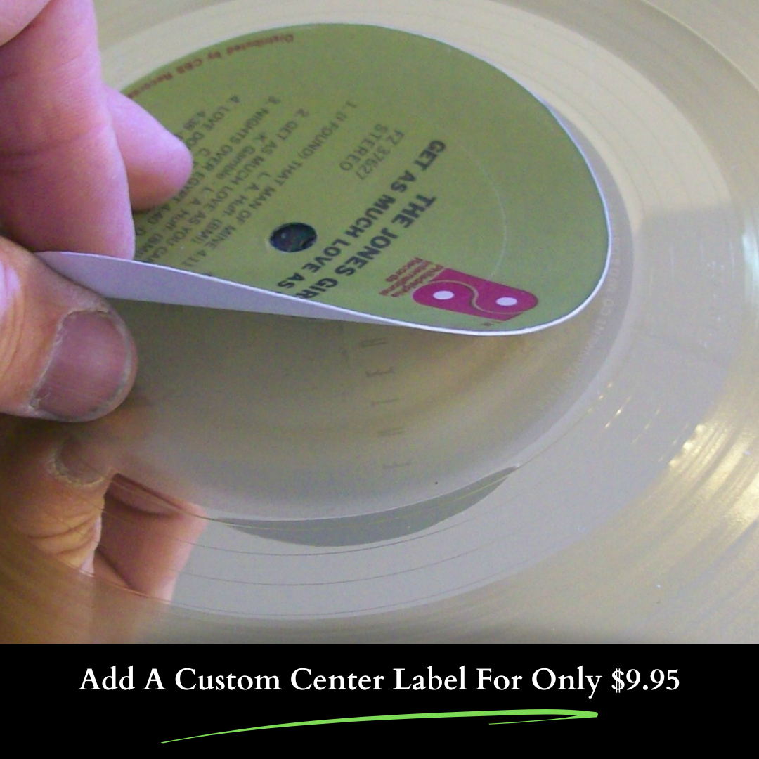 The centre of your record can be customized to your preference, whether it's a label, picture, text or company logo.